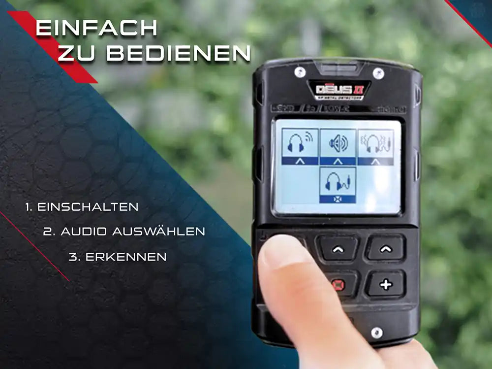 Der XP DEUS 2 ist besonders einfach zu bedienen: einschalten, Audio auswählen und direkt mit der Suche starten. Die intuitive Menüführung, klaren Symbole und Schnellzugriffe machen den Einstieg leicht, selbst für Einsteiger, und ermöglichen Profis gleichzeitig eine schnelle Feinabstimmung. So bist du in wenigen Sekunden startklar und kannst dich voll auf das Sondeln konzentrieren.