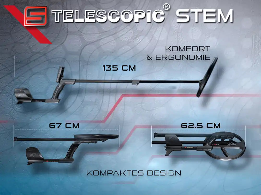 Das XP S-Teleskop-Gestänge des DEUS 2 vereint Komfort, Ergonomie und kompaktes Design in einem ultraleichten Aufbau. Es lässt sich schnell von ca. 67 cm auf bis zu 135 cm ausziehen und ebenso platzsparend zusammenklappen, ideal für Transport, Rucksacktouren und lange Suchsessions. So bekommst du maximale Bewegungsfreiheit bei minimalem Packmaß.