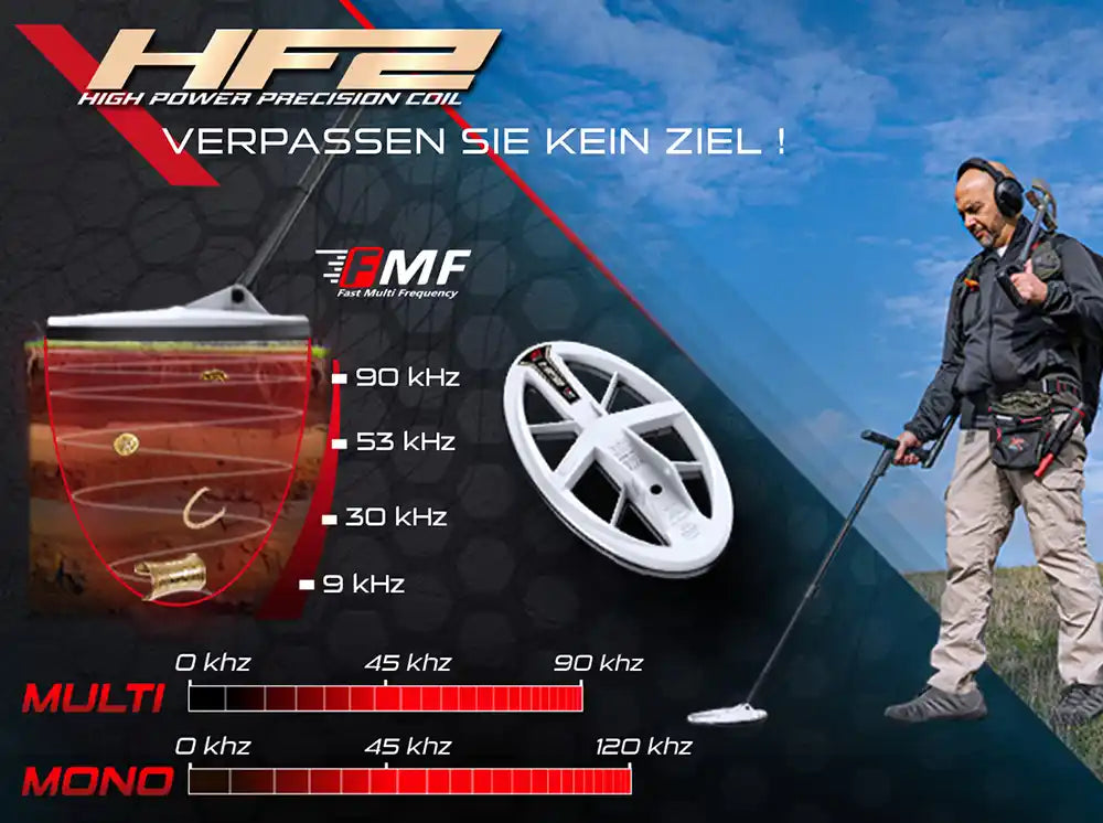 Die FMF-Technologie (Fast Multi Frequency) des XP DEUS 2 arbeitet mit mehreren Frequenzen gleichzeitig und deckt, je nach Spule, einen Bereich von 4 bis 45 kHz ab (HF2 sogar bis 120 kHz). Dadurch reagiert der Detektor besonders schnell und präzise, trennt Ziele sauber in eisenhaltigen Böden und bleibt auch bei schwierigen Bedingungen stabil. Ideal für alle, die maximale Reaktionsgeschwindigkeit, zuverlässige Tiefenleistung und flexible Anpassung an unterschiedliche Suchsituationen wollen.