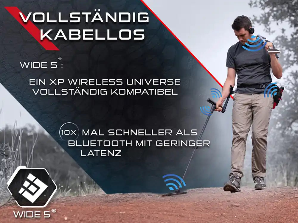 Der XP DEUS 2 ist dank des XP Wireless Universe (WIDE 5) vollständig kabellos: Spule, Fernbedienung und Kopfhörer kommunizieren ohne Kabel. Diese Funktechnologie ist bis zu 10× schneller als Bluetooth und sorgt für extrem geringe Latenz, sodass Signale nahezu verzögerungsfrei übertragen werden. Das Ergebnis: präzise Zielortung, mehr Bewegungsfreiheit und maximaler Komfort beim Sondeln.